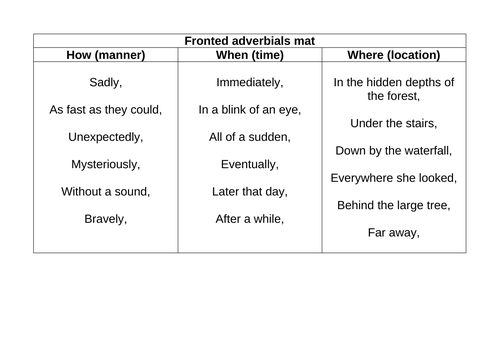 Time fronted adverbials in this category refer to moments, describing when something will happen/has happened. These adverbials can be about a specific date or any general moment. Today, i am going on a trip to the history museum. On this definition, once upon a time is a fronted adverbial, because it gives information about the time of the action. A recap of adverbs adverbial phrases of time, place, manner and frequency fronted adverbials insertion of the comma after fronted adverbial opportunities for pupils to identify adverbs, adverbial phrases and.